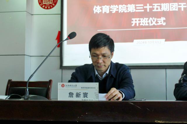 会议伊始,全体成员奏唱中国共产主义青年团歌。随后,党委副书记詹新寰致开幕词。詹书记强调,团干培训的目的是提高学生骨干的政治素养、组织能力和创新精神,培养出一支坚强的团干队伍,为学校发展提供科技和人才支持。他对团干们提出了五点期望:一是坚持理想信念,学习新思想;二是全面提升素质,珍惜培训机会;三是增强服务意识,贴近同学;四是勇于创新,探索新方法;五是锤炼作风,树立榜样。期望团干们秉承“完全人格,首在体育”的院训,勇于开拓,脚踏实地,成长为德智体美劳全面发展的财体人。并预祝培训圆满成功,希望所有团学骨干学有所获,学有所成,学有所用。