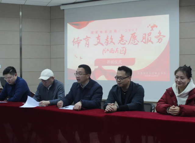 3月29日上午9:00,江西省体育支教志愿服务开班仪式在萃庐C185教室举行,电子游戏-电子游戏平台 院长徐旭川、学工办副主任戴玮、南昌市青少年发展基金会秘书长施展、江西远人企业咨询有限公司总经理孟庆龙、宜春学院老师屈庆龄出席仪式。